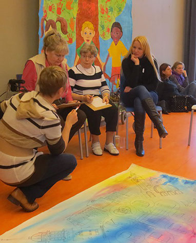 Anna Gebert: “Ein großes Bild „Krefeld“ (1,60 x 1,30 cm) wird für einen guten Zweck versteigert. Viele Kinder und Senioren haben gemeinsam daran gearbeitet. Dabei ist ein wunderbares, buntes und fröhliches Bild entstanden. Die Buchstaben „Krefeld“ sind aus 37 Flaggen zusammengesetzt, denn aus so vielen unterschiedlichen Nationen stammen die Menschen, die in unserem Stadtteil Schicksbaum einen neuen Lebensmittelpunkt gefunden haben. Sie sind ein großes Kulturreichtum für ihre neue Heimat. 20 Prozent des Erlöses geht an das Kulturzentrum „Koklo ku ato“ in Lome, Togo in Afrika. 80 prozent geht an unser Projekt „Sommer Akademie“: Es ist ein Kunst-Projekt, bei dem die Kinder und Erwachsenen kostenfrei neue Bilder in meiner Malschule gestalten können. Schon im vergangenen Jahr haben wir mit dem Projekt „Afrika“ Kinder und Jugendliche aus Lome, unter dem Moto: „Kinder helfen Kinder“, unterstützt. Wir möchten uns weiterhin für diese Kinder einsetzen und Freundschaft aufbauen denn: “Freundschaft die Zusammen hält, so verändern wir die Welt“.