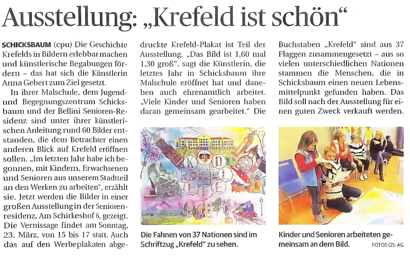 Die Krefelder Künstlerin Anna Gebert hat sich mit ihrem Atelier und Malschule ihres sozialen und ehrenamtlichen Engagements zum Ziel gesetzt, die Geschichte Krefelds in Bildern erlebbar zu machen. Unter ihrer künstlerischen Anleitung entstanden in Kooperation des Jugend- und Begegnungszentrums der Caritas in Schicksbaum, der BELLINI Senioren-Residenz Krefeld GmbH und dem Atelier Anna Gebert im Rahmen eines gemeinsamen Projektes beeindruckende Werke, die dem Betrachter einen anderen Blick auf Krefeld und dessen Schönheit eröffnen soll.
