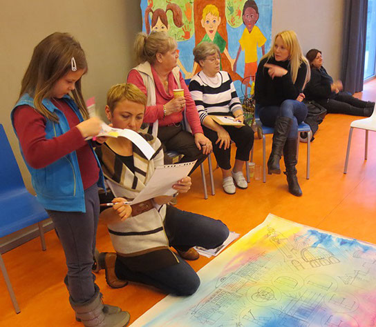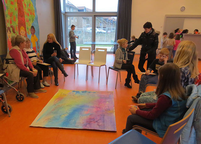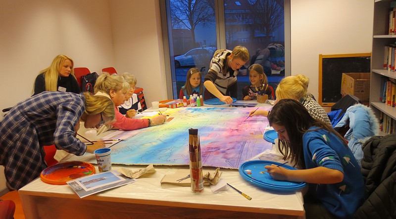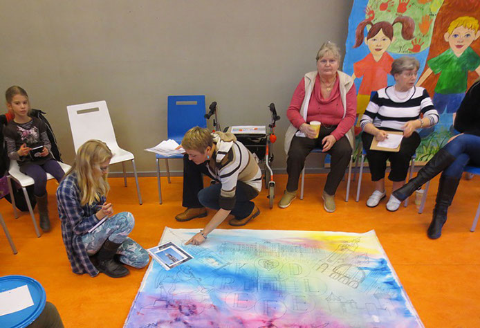 Anna Gebert: “Ein großes Bild „Krefeld“ (1,60 x 1,30 cm) wird für einen guten Zweck versteigert. Viele Kinder und Senioren haben gemeinsam daran gearbeitet. Dabei ist ein wunderbares, buntes und fröhliches Bild entstanden. Die Buchstaben „Krefeld“ sind aus 37 Flaggen zusammengesetzt, denn aus so vielen unterschiedlichen Nationen stammen die Menschen, die in unserem Stadtteil Schicksbaum einen neuen Lebensmittelpunkt gefunden haben. Sie sind ein großes Kulturreichtum für ihre neue Heimat. 20 Prozent des Erlöses geht an das Kulturzentrum „Koklo ku ato“ in Lome, Togo in Afrika. 80 prozent geht an unser Projekt „Sommer Akademie“: Es ist ein Kunst-Projekt, bei dem die Kinder und Erwachsenen kostenfrei neue Bilder in meiner Malschule gestalten können. Schon im vergangenen Jahr haben wir mit dem Projekt „Afrika“ Kinder und Jugendliche aus Lome, unter dem Moto: „Kinder helfen Kinder“, unterstützt. Wir möchten uns weiterhin für diese Kinder einsetzen und Freundschaft aufbauen denn: “Freundschaft die Zusammen hält, so verändern wir die Welt“.